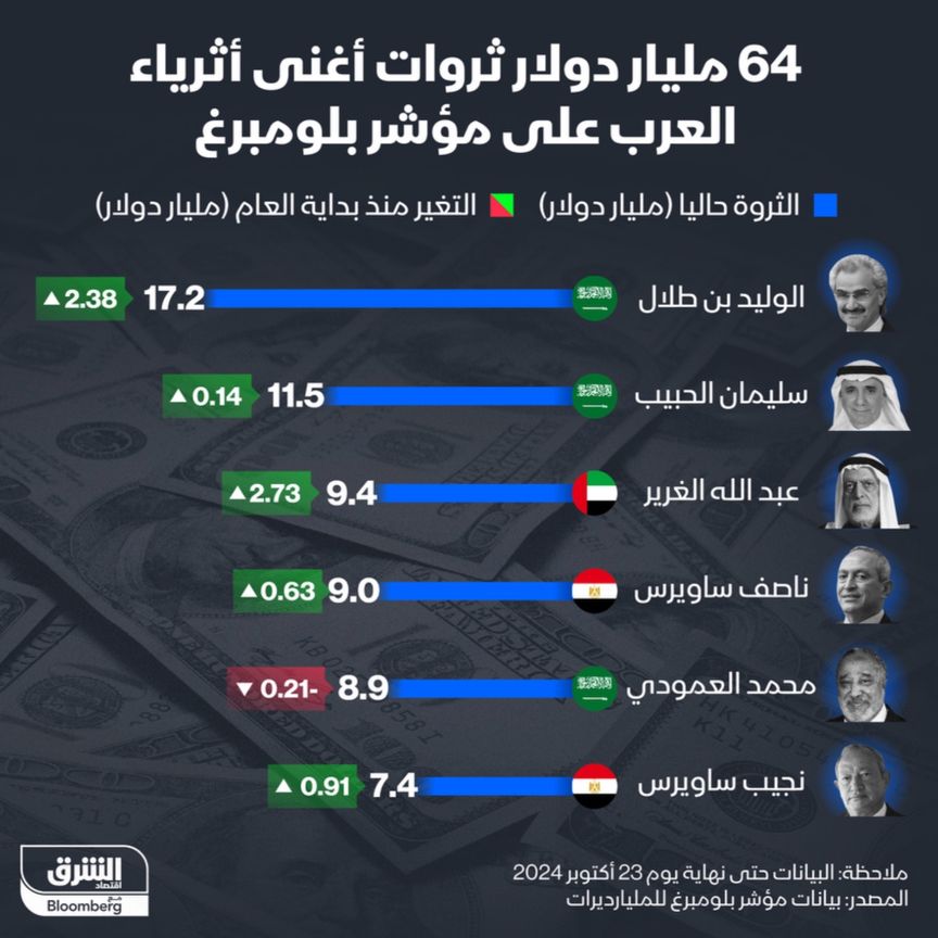 بلغ إجمالي قيمة ثروات أغنى: (06) أثرياء عرب؛ نحو: (64) مليار دولار، وفق مؤشر (بلومبيرغ) للمليارديرات.