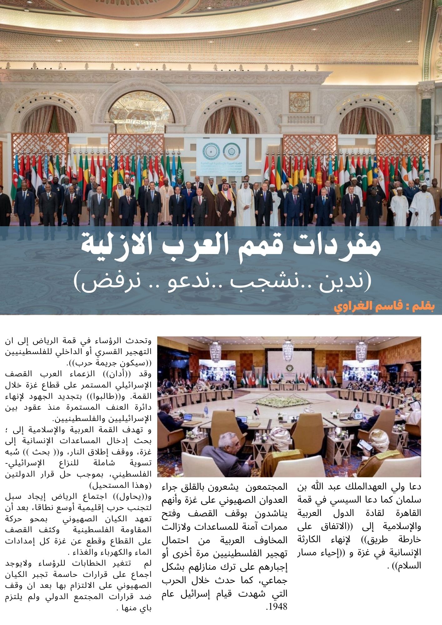 رابعا : من المؤكد إن قرارات العرب في هذه القمة غير ملزمة للكيان الصهيوني ولاتحترمها ، والعرب ليسوا في موقف قوي ليتم فرض قراراراتهم بل هم في أضعف الإيمان وادناه .